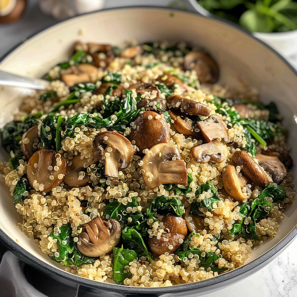 Start by cooking the quinoa according to package instructions while sautéing mushrooms with garlic in olive oil. Once mushrooms are tender, add spinach until wilted, then combine everything and season to taste.