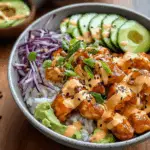 Making a Bang Bang Chicken Bowl at home is simple! Start by cooking your choice of chicken until it’s golden brown. Prepare the sauce using mayonnaise, sweet chili sauce, and sriracha for heat. Combine the cooked chicken with your sauce and set it aside. In a bowl, layer rice or noodles, fresh veggies like cucumbers and carrots, and top with the saucy chicken. Garnish with green onions or sesame seeds for extra flavor.