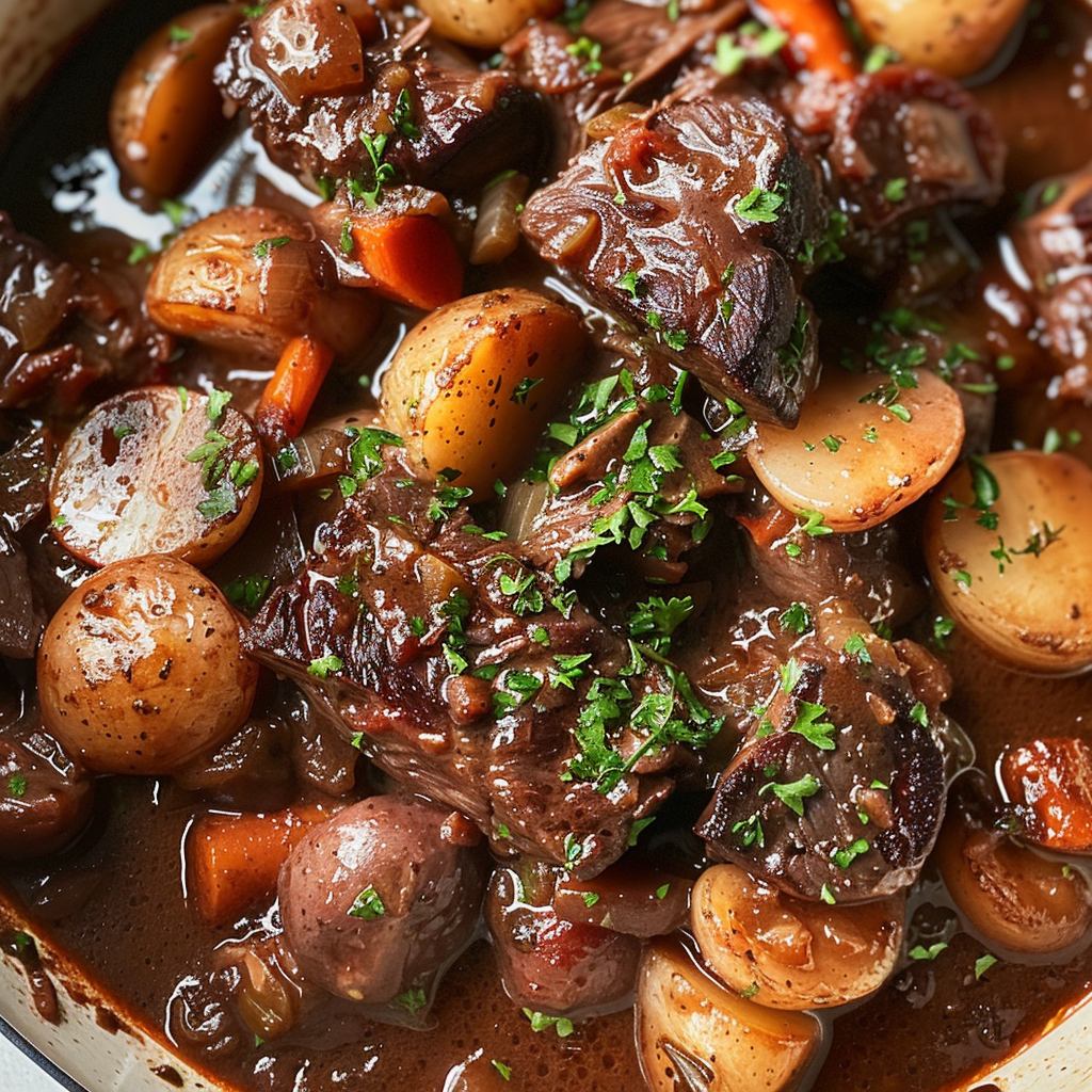 In a large Dutch oven over medium-high heat, cook bacon lardons until crispy. Remove and set aside. In the same pot with rendered fat, sear beef cubes in batches until browned on all sides. try our brown sugar maple cookies Don’t rush this step—those crispy edges are what dreams are made of!