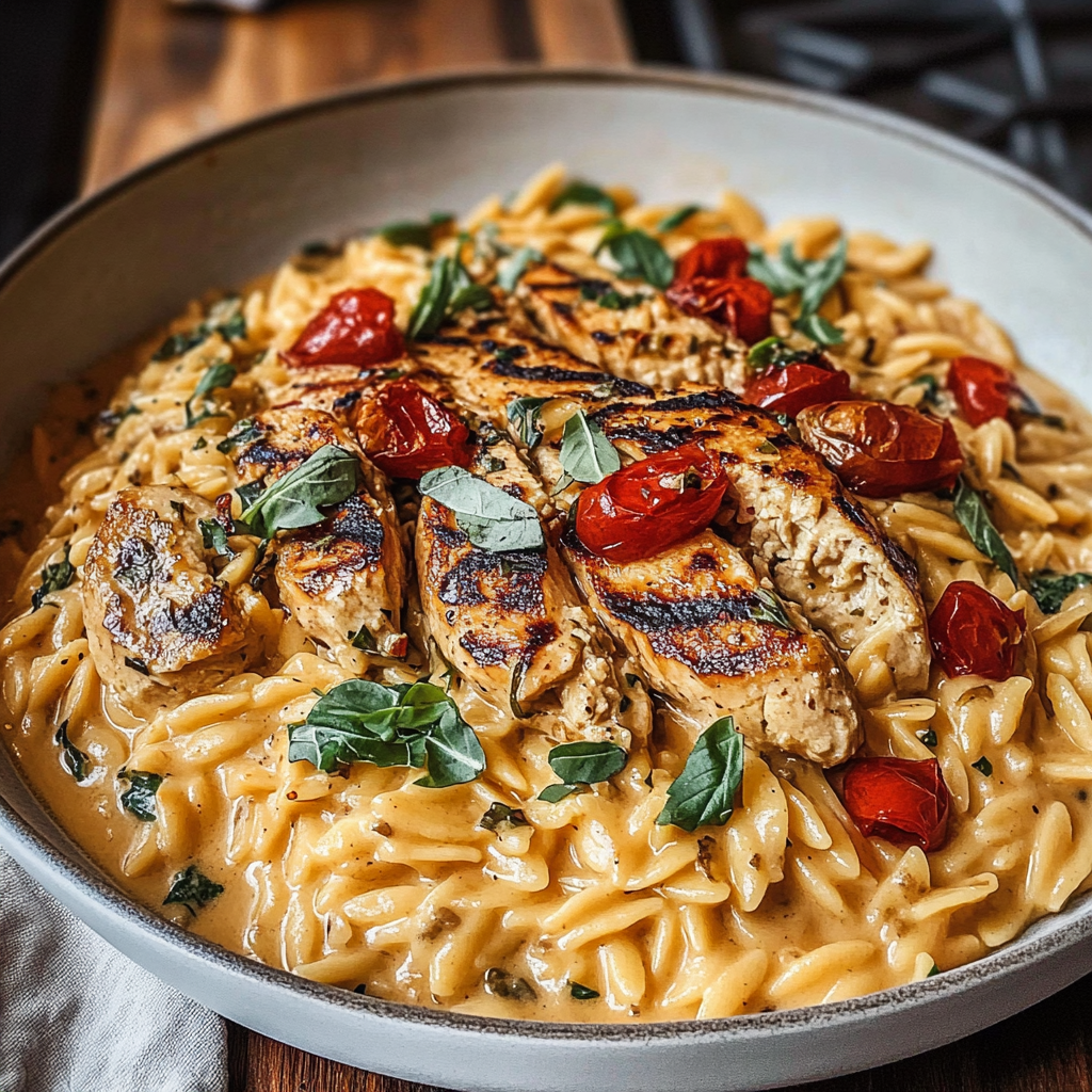 Slice your rested chicken breasts into bite-sized pieces atop your glorious orzo mixture. Garnish with extra Parmesan if you’re feeling fancy! Transfer to plates and drizzle with sauce for the perfect finishing touch.