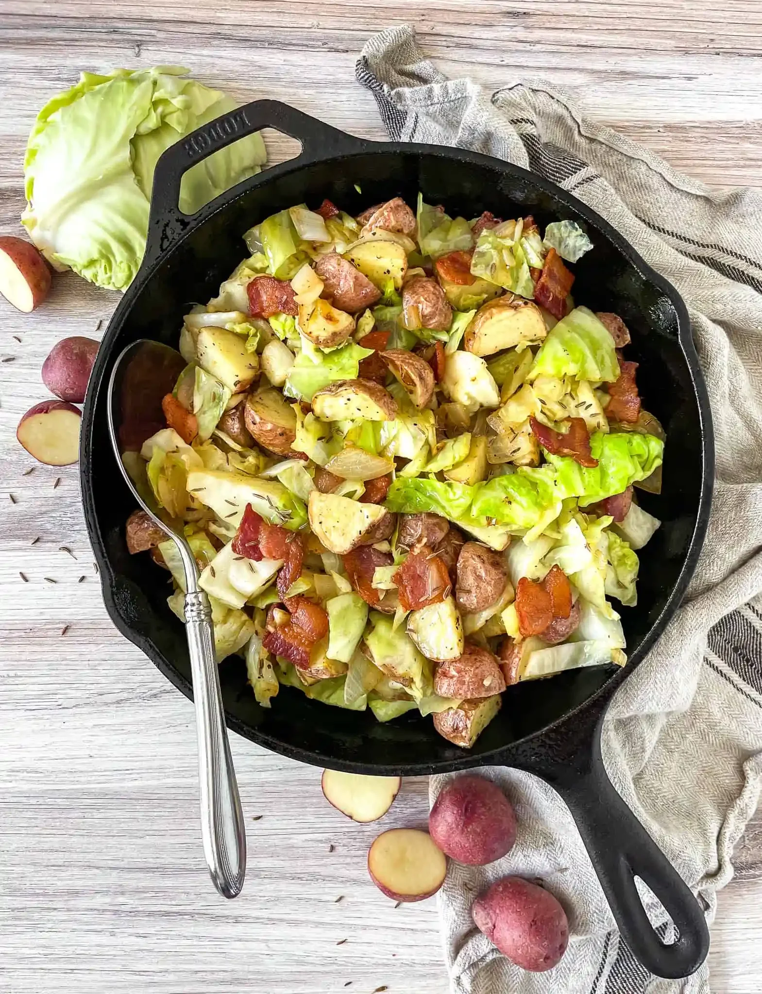 Reheating: Reheat cabbage and roasted potatoes in the oven or microwave until heated through. Add a splash of water when microwaving to keep them moist.
