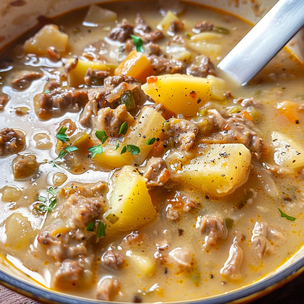 Start by browning your beef in a large pot, then add chopped onions and garlic until fragrant. Next, toss in diced potatoes and broth before letting it simmer to perfection. Finally, stir in cheese for that creamy goodness.