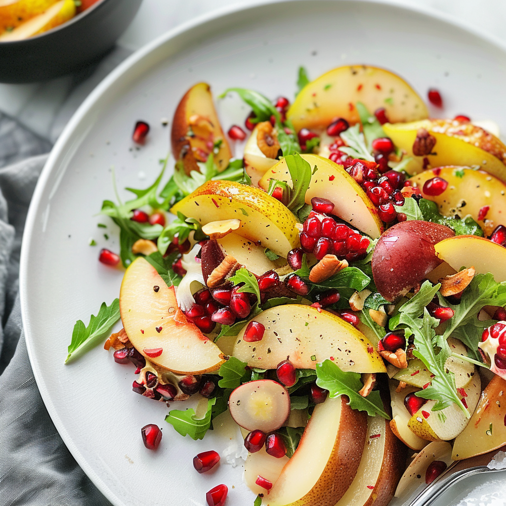 Start by prepping your ingredients: chop the pears, deseed the pomegranate, and mix the dressing. Combine everything in a bowl, tossing gently to avoid bruising the fruit, and voilà! Your Easy Pear and Pomegranate Salad is ready to impress.