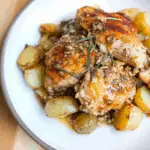 - Pour sauce over chicken and potatoes, ensuring everything is well coated.