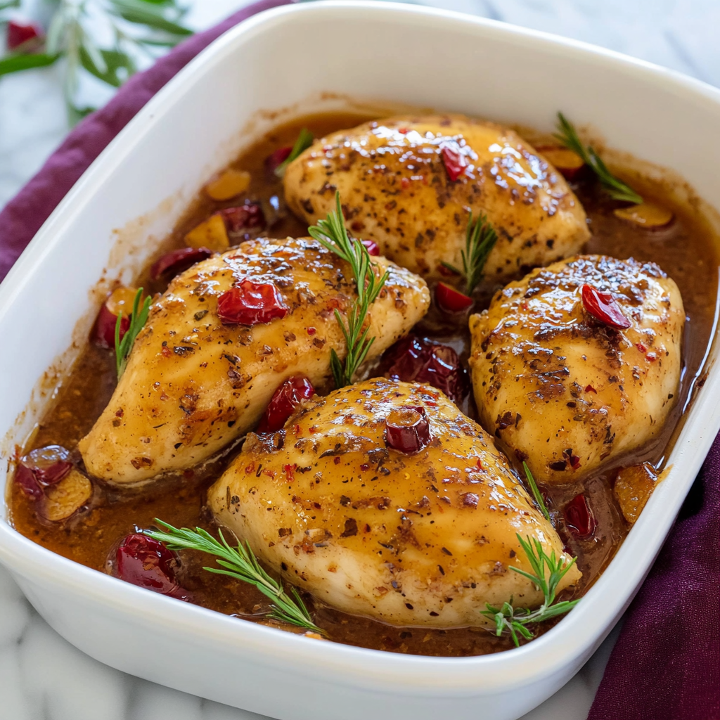 Once baked, transfer the chicken to plates and drizzle any remaining sauce from the pan over top for an extra splash of flavor. Pair this succulent dish with some roasted veggies or fluffy rice for a complete meal.