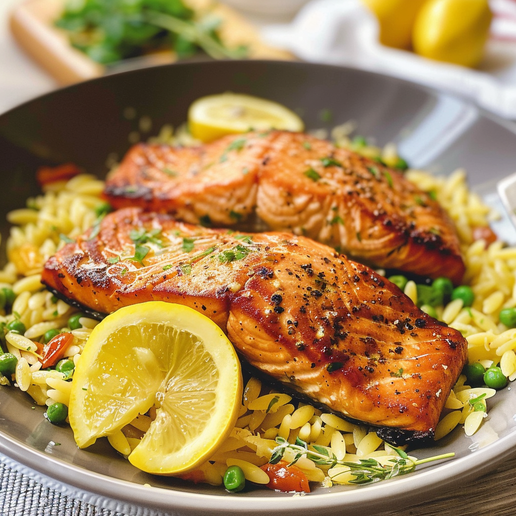• This amazing Seared Salmon with Lemon Orzo offers more than just flavor; it makes meal prep a breeze.