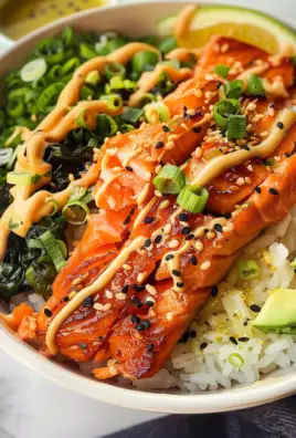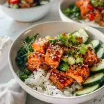 Spicy Salmon Bowls with Coconut Rice is a flavorful dish that combines tender, marinated salmon with creamy coconut rice. The salmon is seasoned with a blend of spices that add heat and depth, while the coconut rice provides a rich and slightly sweet contrast. This dish is often topped with fresh vegetables and garnishes, making it both nutritious and visually appealing. It’s perfect for a quick weeknight dinner or meal prep, offering a delightful mix of flavors and textures.