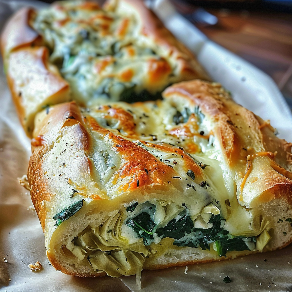 Start by preheating your oven while you prepare the filling. Sauté garlic and spinach first, then mix with cream cheese, artichokes, and seasonings before stuffing the bread. Bake until golden brown to ensure a crispy exterior.