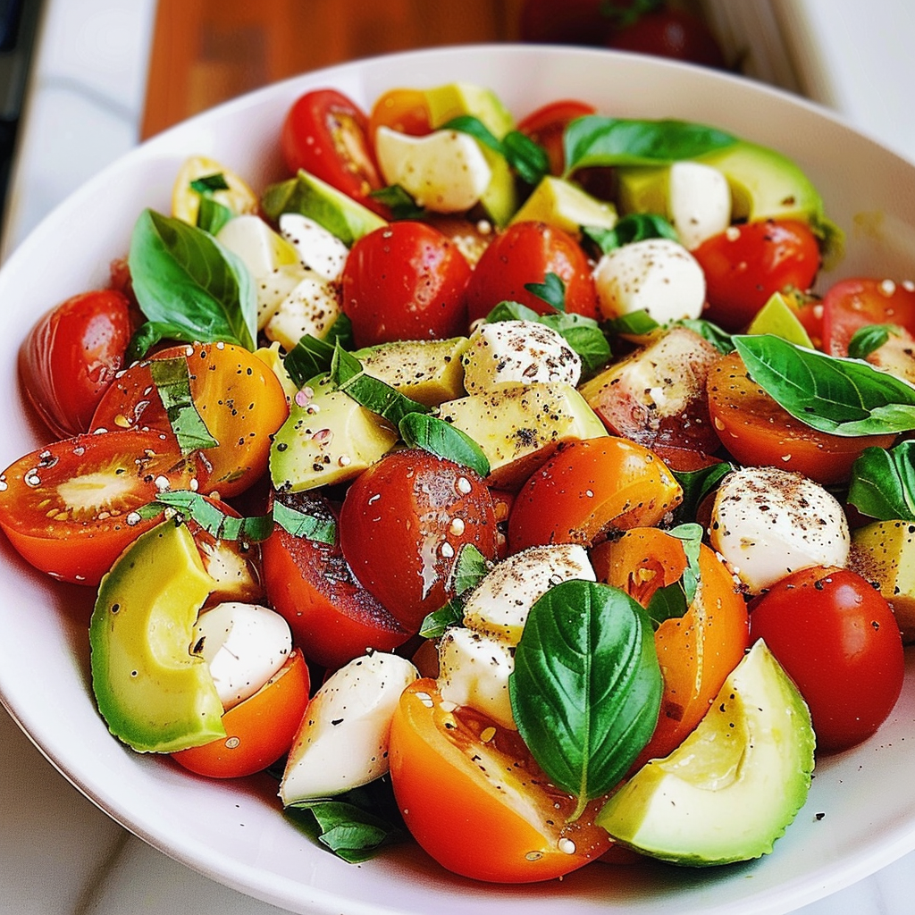 Start by chopping your tomatoes, avocados, and mozzarella into bite-sized pieces. Then, mix them gently in a bowl while whisking together olive oil, lemon juice, salt, and pepper in another. Pour the dressing over the salad and toss lightly for even coating.